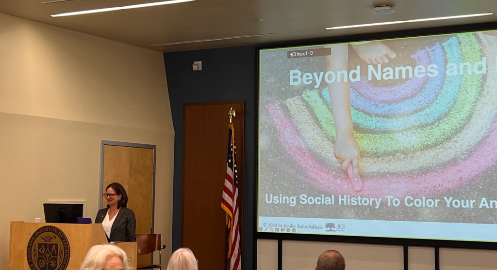 - “Beyond Names and Dates: Using Social History to Color Your Ancestors’ Stories,” presentation for the Rhode Island Genealogical Society’s annual meeting, May 2024, https://www.rigensoc.org/eventListings.php?nm=73&ec=1&tf=P